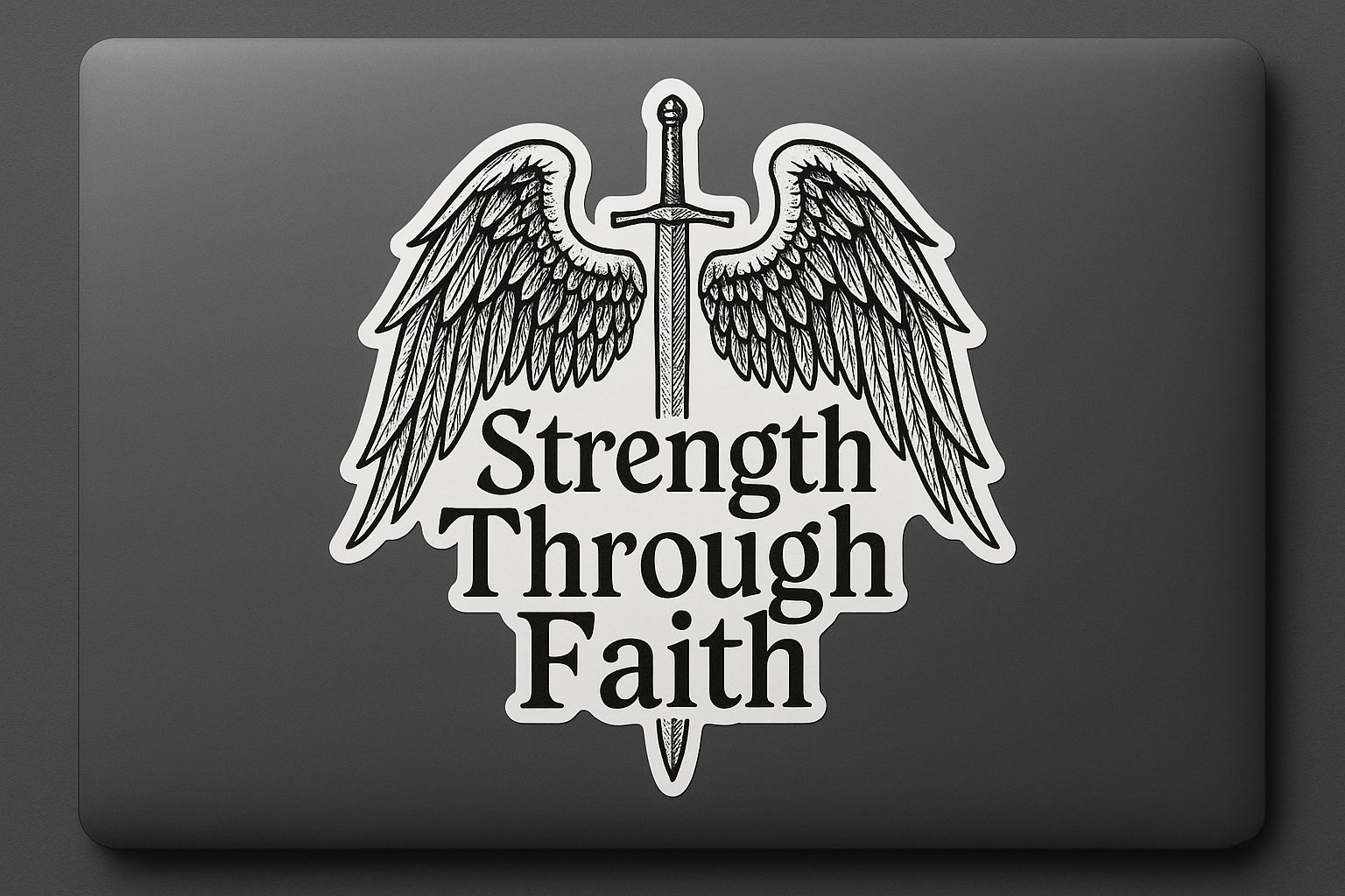 Archangel Michael Wings and Sword Sticker Decal Tattoo Style Art Inspirational “Strength Through Faith” Vinyl Laptop Car Window Bumper AUTO Water Bottle Helmets Waterproof